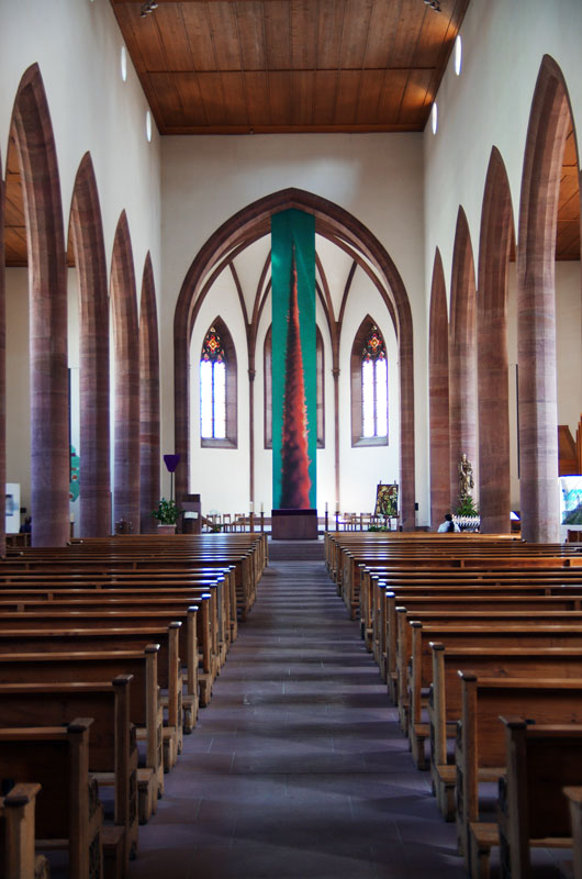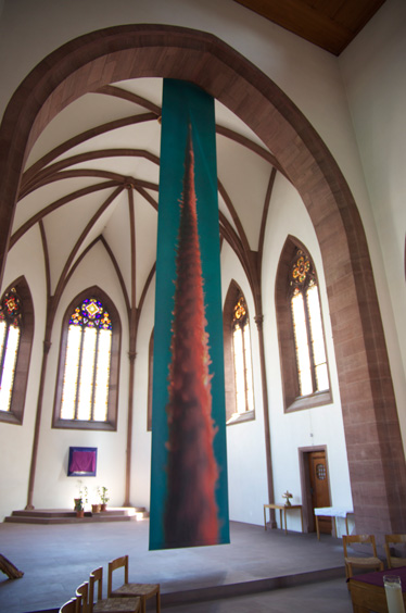 Installation Clarakirche Basel Stoffdruck 11.3 x 1.55 m Vor 800 Jahren am Samstag vor Palmsonntag floh Clara von Assisi aus dem adeligen Elternhaus zur Potiunkula-Kapelle. Dort schnitt Franz von Assisi ihr die Haare und legte ihr ein Büssergewand an. Claraplatz Basel |