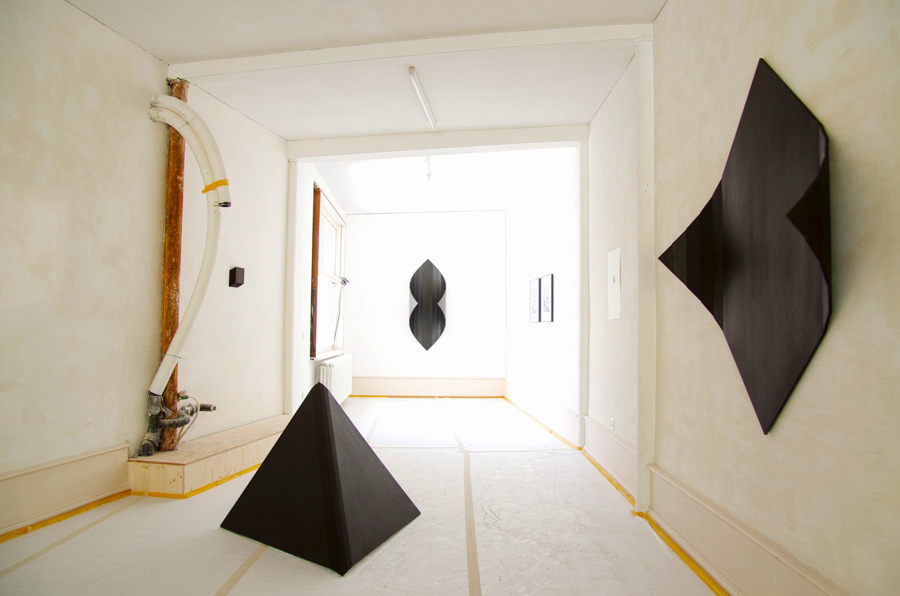 Einblick in die Ausstellung schwarz sehen, 2014 Hammerstr. 90, Basel 1 m2 Mdf schwarz 14, 17 + 19 Kubus schwarz