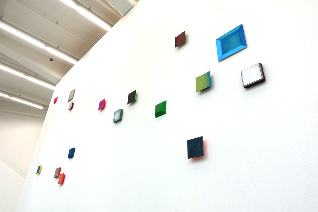Regionale 19 Kunsthaus Baselland Installation Quadratbilder Serie 2018 Detailansichten 16 Stk. je 17 x 17 x 4 cm Mischtechnik auf Mdf 2 Stk. je 29 x 29 x 1 cm C-Print auf Archivalpapier auf Alu